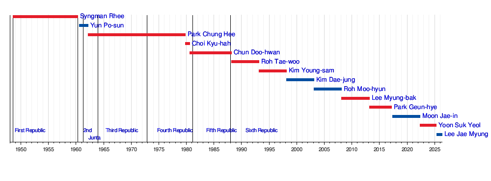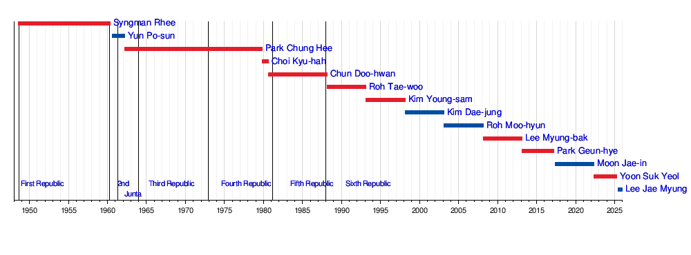 | Conservative | 9 | 21765 days | Choi Kyu-hah, Chun Doo-hwan, Kim Young-sam, Lee Myung-bak, Park Chung Hee, Park Geun-hye, Roh Tae-woo, Syngman Rhee, and Yoon Suk Yeol | |