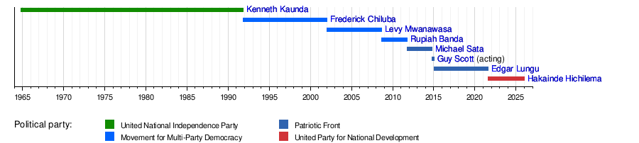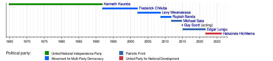 The first president was Kenneth Kaunda in 1964. After him, six other people have been president since 1991. These include Frederick Chiluba, Levy Mwanawasa, Rupiah Banda, Michael Sata, Edgar Lungu, and the current president, Hakainde Hichilema. Also, Guy Scott was an acting president for a short time after President Michael Sata passed away.