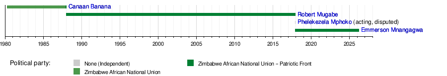 31 December 1987 | 21 November 2017 | 29 years, 325 days | ZANU–PF | 1987 (indirect) 1990 1996 2002 2008 |