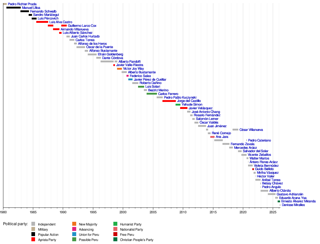 This timeline shows the different Prime Ministers of Peru since 1980 and their political affiliations.