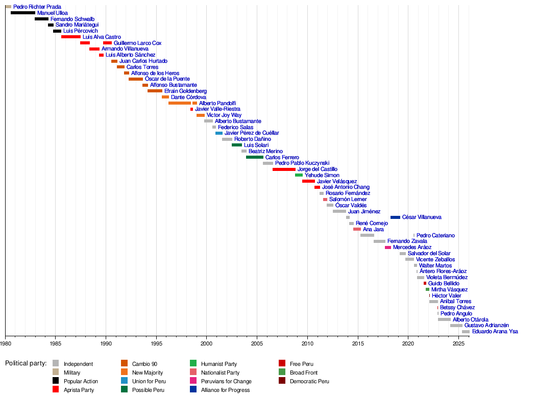 This timeline shows who has been Prime Minister of Peru since 1980 and which political party they belonged to.