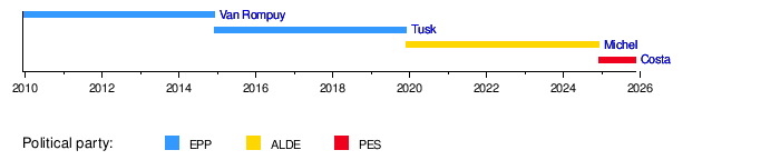 The first meetings of European country leaders happened in 1961. They became official in 1974 and were called the "European Council." For many years, the leader of the European Council changed every six months. It was always the leader of the country that was holding the EU presidency at that time.