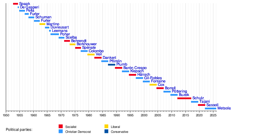 Presidents serve for two and a half years. Usually, the two biggest political groups take turns holding the position. Since the Parliament started in 1952, there have been 30 presidents. Seventeen of them have served since the first time people voted for Parliament members in 1979. So far, three women have been President. Most presidents have come from the older EU countries.