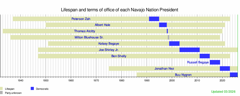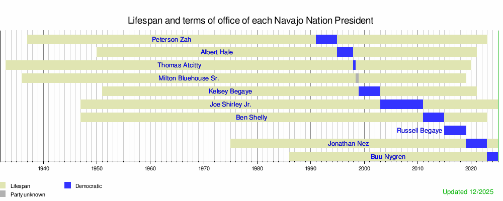 This chart shows how long each Navajo Nation President lived and when they were in office. They are listed in the order they served.