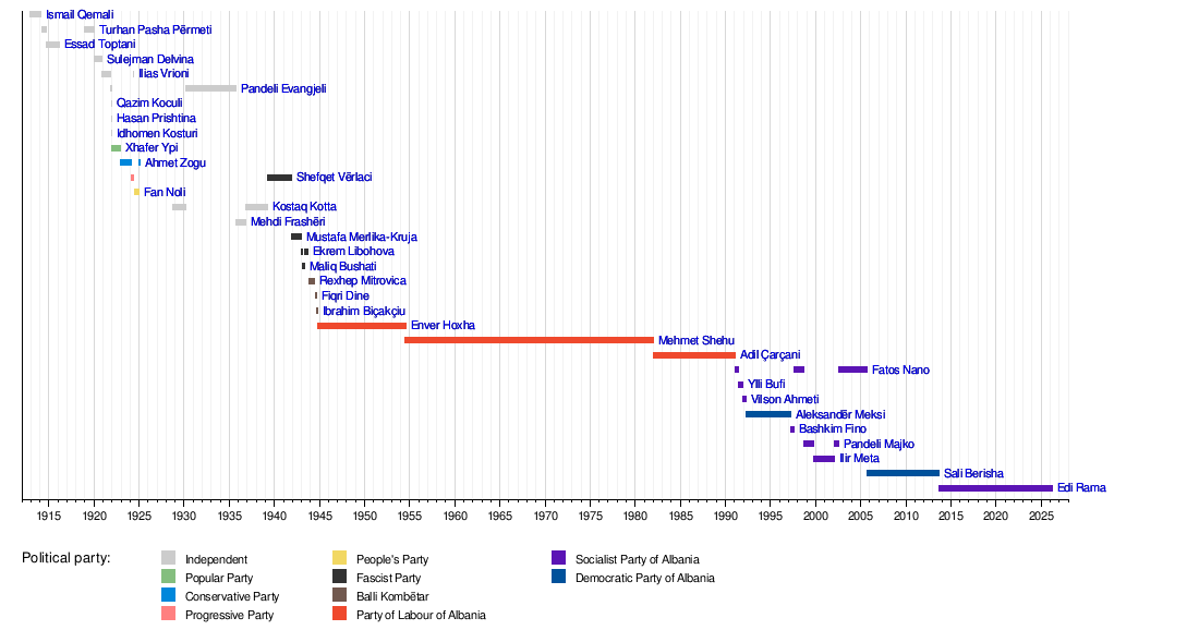 After Albania declared independence in 1912, the job of Prime Minister became a key part of the country's government. Many leaders took on this role during a time of big changes and conflicts.