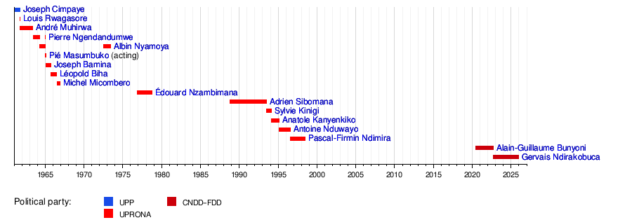 This section lists the people who have served as Prime Minister of Burundi. The tables show when they were in office and what political party they belonged to.