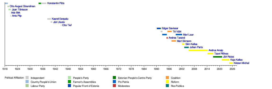 Usually, the Prime Minister is the leader of the biggest party in the group of parties that form the government. This is because the Prime Minister needs the support of the parliament to stay in their job. The current Prime Minister is Kristen Michal from the Reform Party. He started his job on July 23, 2024, after the previous Prime Minister, Kaja Kallas, resigned.