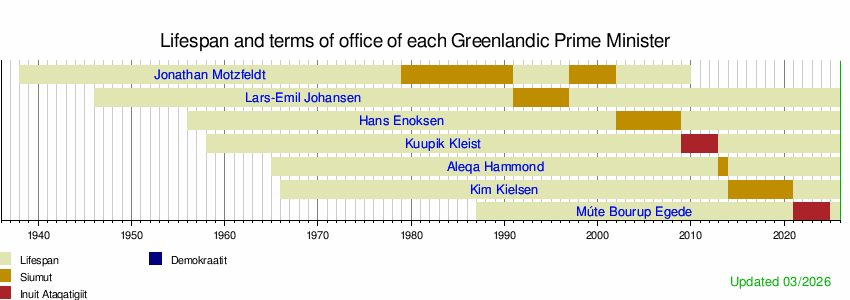 This timeline shows how long each Prime Minister of Greenland lived and when they were in office. Jonathan Motzfeldt is shown from his first time as Prime Minister.