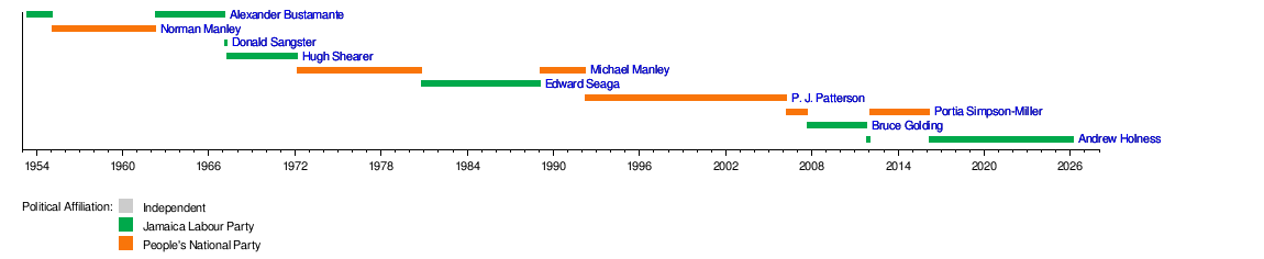 Mr. Holness is the leader of the Jamaica Labour Party (JLP). He became prime minister on March 3, 2016. He was re-elected on September 7, 2020, after his party won a big victory in the 2020 general election. The Governor-General officially appoints the prime minister. The Governor-General represents King Charles III in Jamaica.