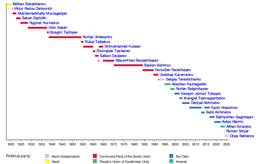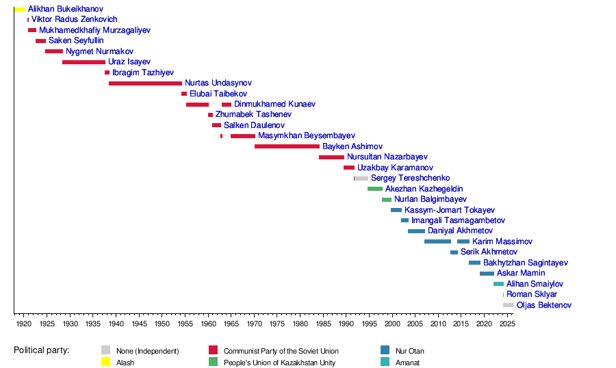 This timeline shows when each Prime Minister served in Kazakhstan's history.