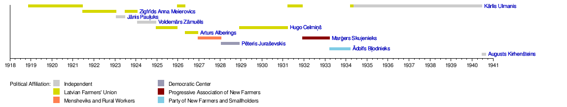Here are the political parties these leaders belonged to: Latvian Farmers' Union Independent Mensheviks and Rural Workers Democratic Centre Progressive Association of New Farmers New Farmers-Small Landowners Party