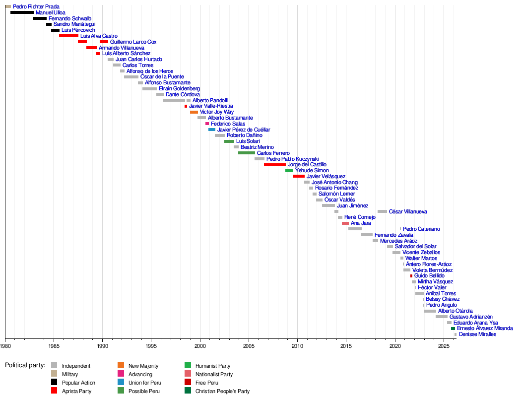 This timeline shows the different Prime Ministers of Peru since 1980 and their political affiliations.