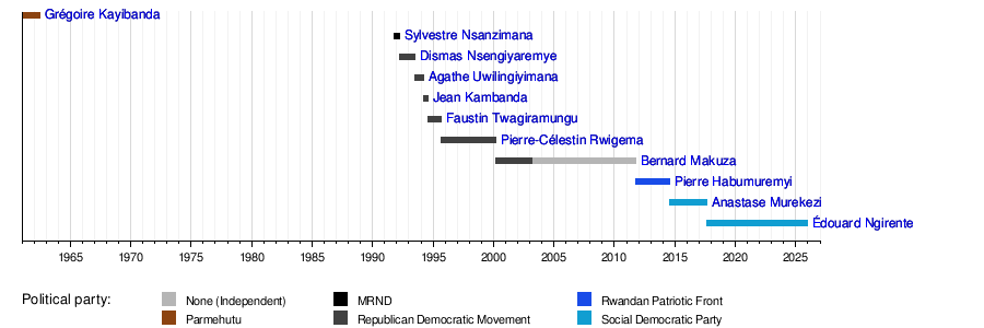 July 19 1994 | August 31 1995 | 1 year, 43 days | Hutu | MDR | Pasteur Bizimungu (1994–2000) |
