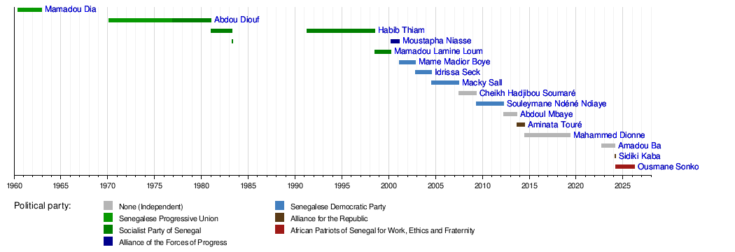 Here is a list of the people who have served as Prime Minister of Senegal since 1960. You can see which political party they belonged to and who was President during their time in office.