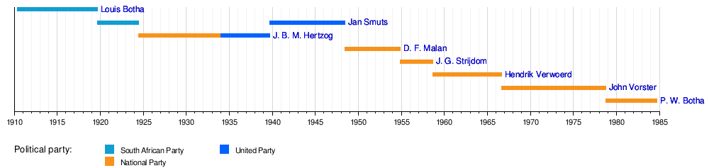 The prime minister of South Africa (Afrikaans: Eerste Minister van Suid-Afrika) was the main leader of the government in South Africa. This important role existed from 1910 until 1984.