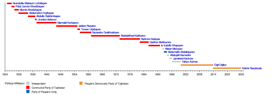 This timeline shows when each Prime Minister served in Tajikistan, including earlier leaders from when it was part of the Soviet Union. It helps you see how long each person held the position.