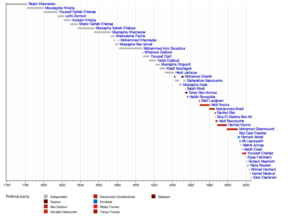Before Tunisia gained its independence, Prime Ministers were not usually part of a political party because they were chosen by the monarch. There were no parliamentary elections until 1956. After independence, Habib Bourguiba became the first Prime Minister chosen through an election in 1956.