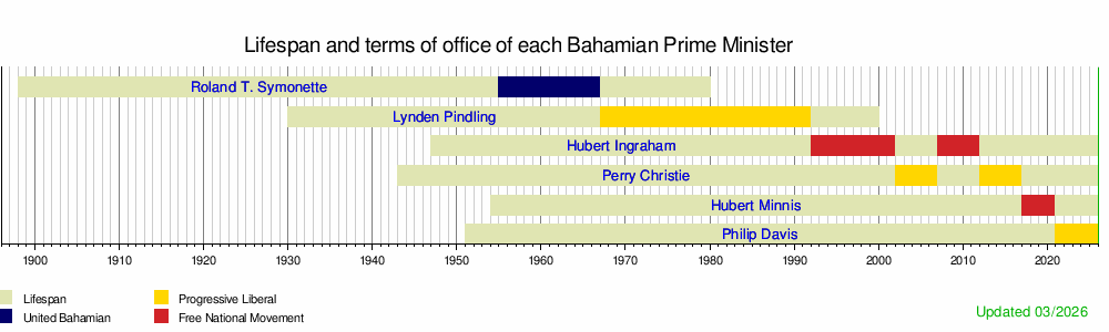 This chart shows how long each prime minister of the Bahamas lived and when they were in office. They are listed by when they first became prime minister.