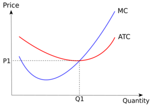 Look at the diagram. The MC line crosses the ATC line at its lowest point. This point is labeled P1 and Q1. This is the sweet spot for productive efficiency.
