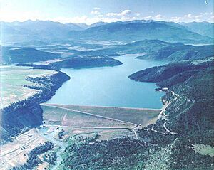 The Ridgway Dam was built as part of a bigger plan called the Dallas Creek Project. Building started in 1978 and finished in 1987. Because of the dam's construction, a main road, U.S. Highway 550, had to be moved. Also, a part of the Denver and Rio Grande Western Railroad that went through the area was no longer used.