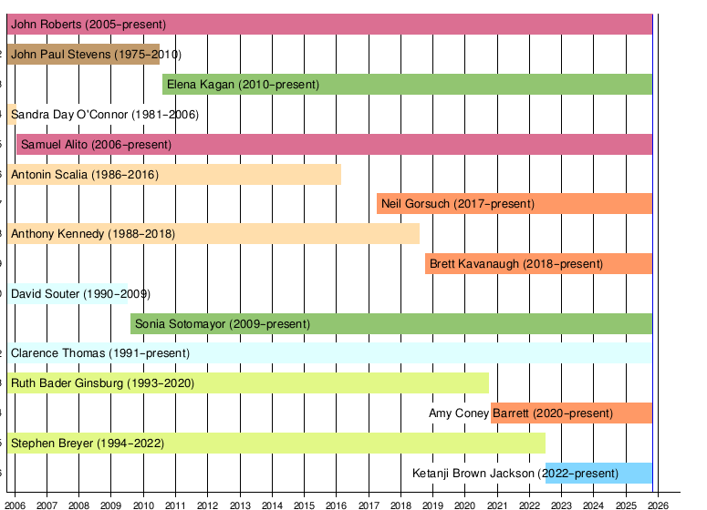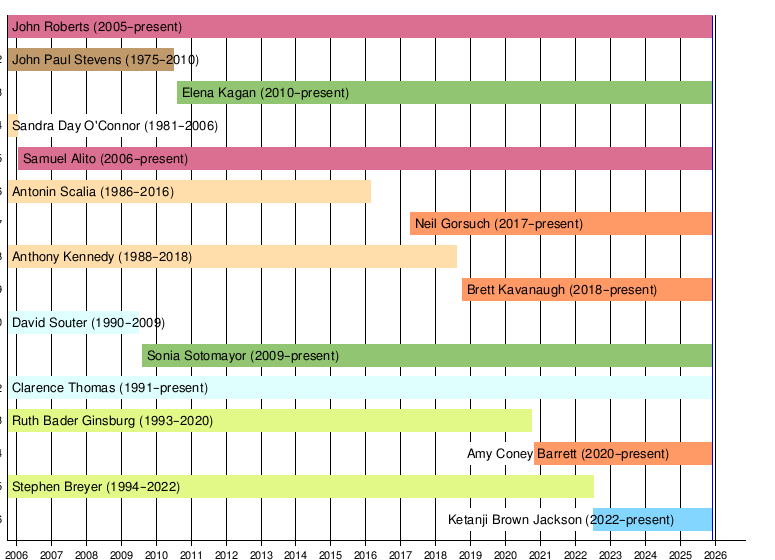 The Roberts Court officially began with Chief Justice Roberts and the eight associate justices who were already serving from the Rehnquist Court. These were Justices Stevens, O'Connor, Antonin Scalia, Anthony Kennedy, David Souter, Clarence Thomas, Ruth Bader Ginsburg, and Stephen Breyer.