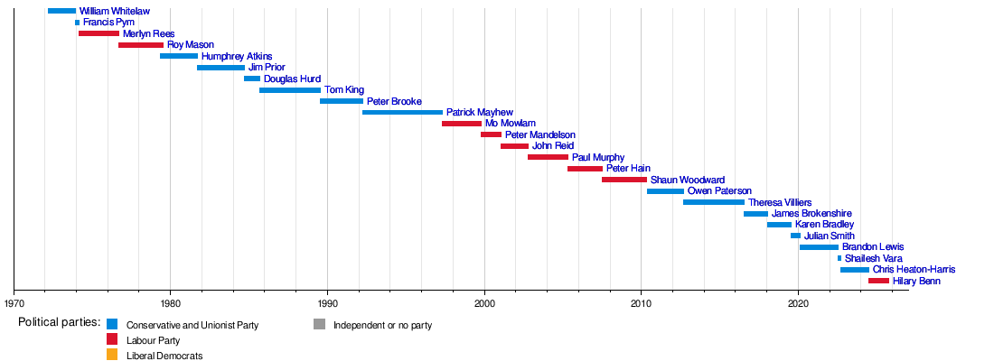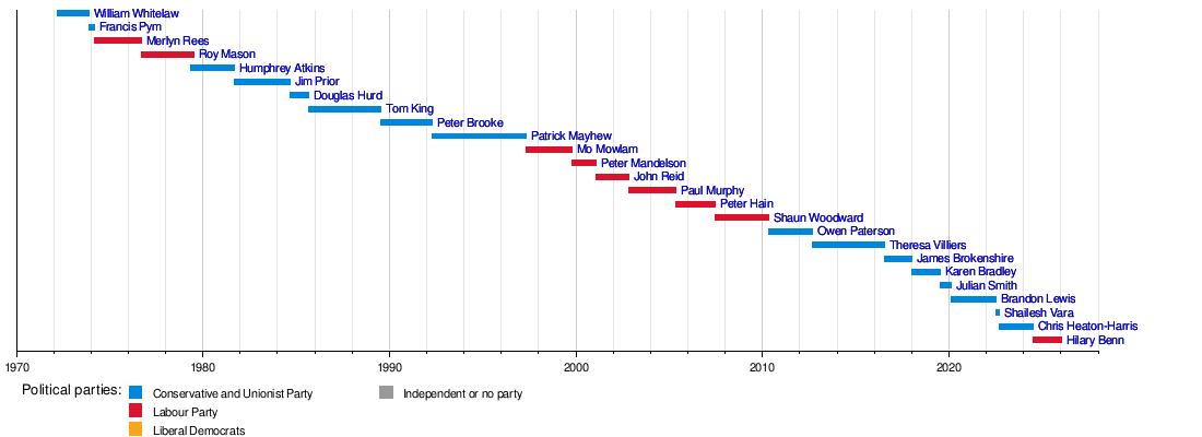 Since 1972, the position has been held by members of either the Conservative Party or the Labour Party. These Secretaries of State do not represent a constituency in Northern Ireland. This is different from the Secretaries of State for Scotland and Wales.