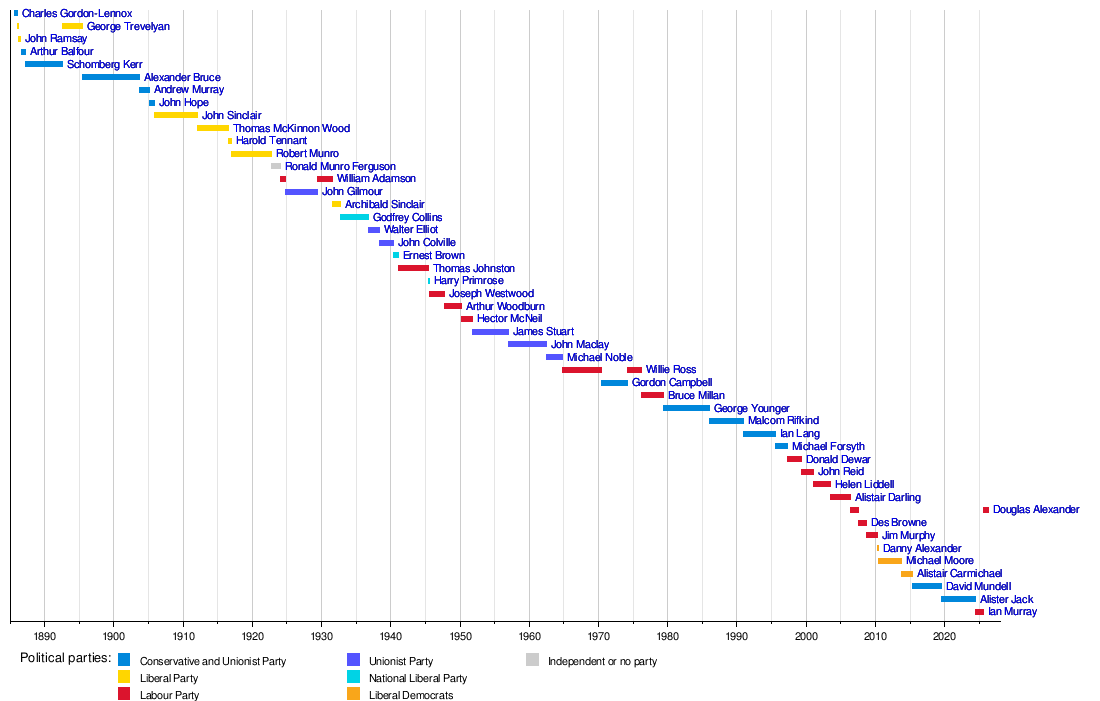 The current Secretary of State for Scotland is Douglas Alexander. He was appointed by Prime Minister Keir Starmer in September 2025. He works with other ministers in the Scotland Office. His main helper is the Parliamentary Under-Secretary of State for Scotland. There is also a Shadow Secretary of State for Scotland from the opposition party.