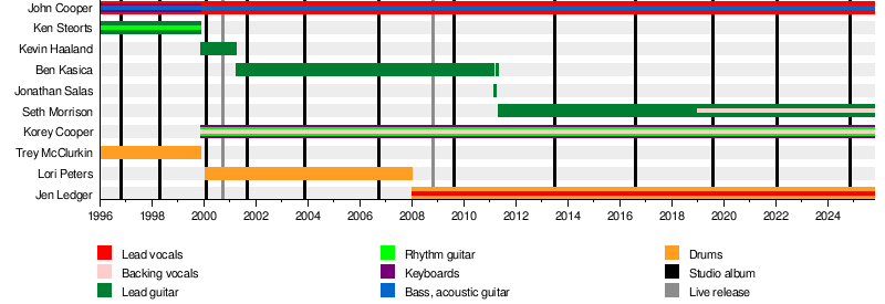 Before their third album, Invincible, Ken Steorts left the band. Kevin Haaland became the new guitarist. Korey Cooper then joined the band permanently. This made Invincible have a more electronic sound. Soon after, drummer Trey McClurkin left. Lori Peters took his place.