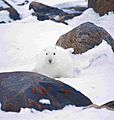 The snowshoe hare (Lepus americanus) is a type of hare found in North America. People also call it the varying hare or snowshoe rabbit. It gets its name "snowshoe" because its large back feet work like snowshoes. These big feet stop it from sinking into deep snow. Plus, the fur on its feet keeps them warm in cold weather.