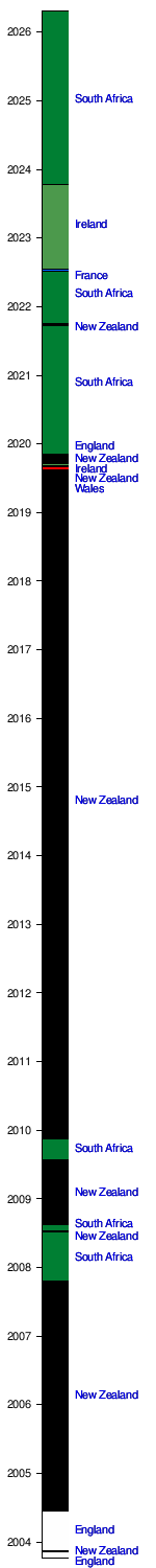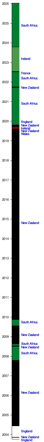 South Africa won the World Cup again 12 years later. They beat England 15–6 in the 2007 final. After this win, the Springboks became the number one team in the world rankings. They were also named the 2008 World Team of the Year. They won their third World Cup in 2019, beating England 32–12 in the final. They were named World Team of the Year again in 2020. In 2023, they won their fourth World Cup, keeping their title as world champions.