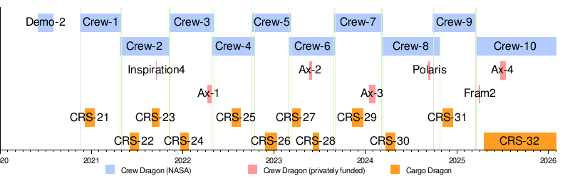 | C207 | Resilience | Crew | Active | 4 | 167d 6h 29m (Crew-1) | 178d 19h 17m | First flew on Crew-1. It has also flown private missions like Inspiration4, Polaris Dawn, and Fram2. | |