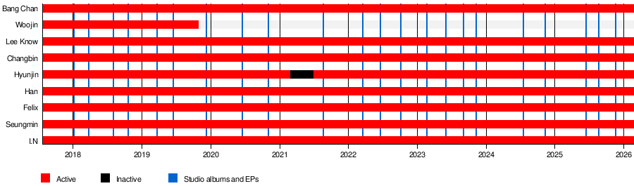 On October 28, 2019, Woojin left the band. From February to July 2021, Hyunjin was on hiatus but resumed regular activities with the group in August. Bang Chan, Changbin, and Han are also members of the in-house songwriting and production team 3Racha. They are often involved in writing lyrics and composing for the group.