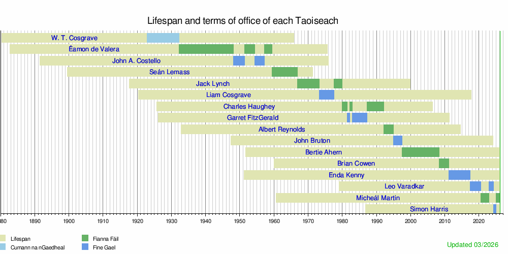 After the 2020 Irish general election, Fianna Fáil and Fine Gael formed a government together for the first time. They decided to share the role of Taoiseach. Micheál Martin was Taoiseach first, and then he became Tánaiste (deputy prime minister) under Leo Varadkar of Fine Gael. This rotation continued after the 2024 Irish general election.