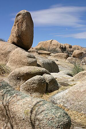 Texas Canyon is a special valley in Cochise County, Arizona. It's about 20 miles east of Benson, right along Interstate 10. This amazing canyon is famous for its huge granite rocks. They look like giant sculptures! The canyon sits between the Little Dragoon Mountains and the Dragoon Mountains. Many people who love rocks (called rockhounds) and photographers visit here.