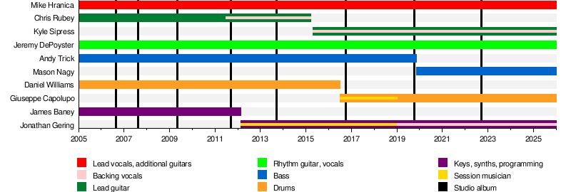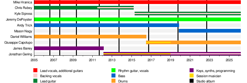 The current members are Mike Hranica (who sings and plays extra guitar), Jeremy DePoyster (who plays rhythm guitar and sings), Kyle Sipress (who plays lead guitar and sings backing vocals), Mason Nagy (bass guitar), Jonathan Gering (keyboards and backing vocals), and Giuseppe Capolupo (drums). The band kept its original members for many years until their keyboard player, James Baney, left.