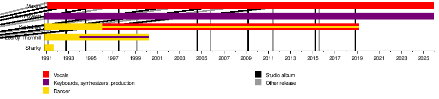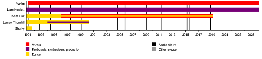Their most successful album was The Fat of the Land (1997). It became number one in 16 countries, including the UK and the US. This album included the popular songs "Firestarter" and "Breathe". Leeroy Thornhill left the band in 2000. Keith Flint passed away in 2019. Now, Liam Howlett and Maxim are the only two original members.