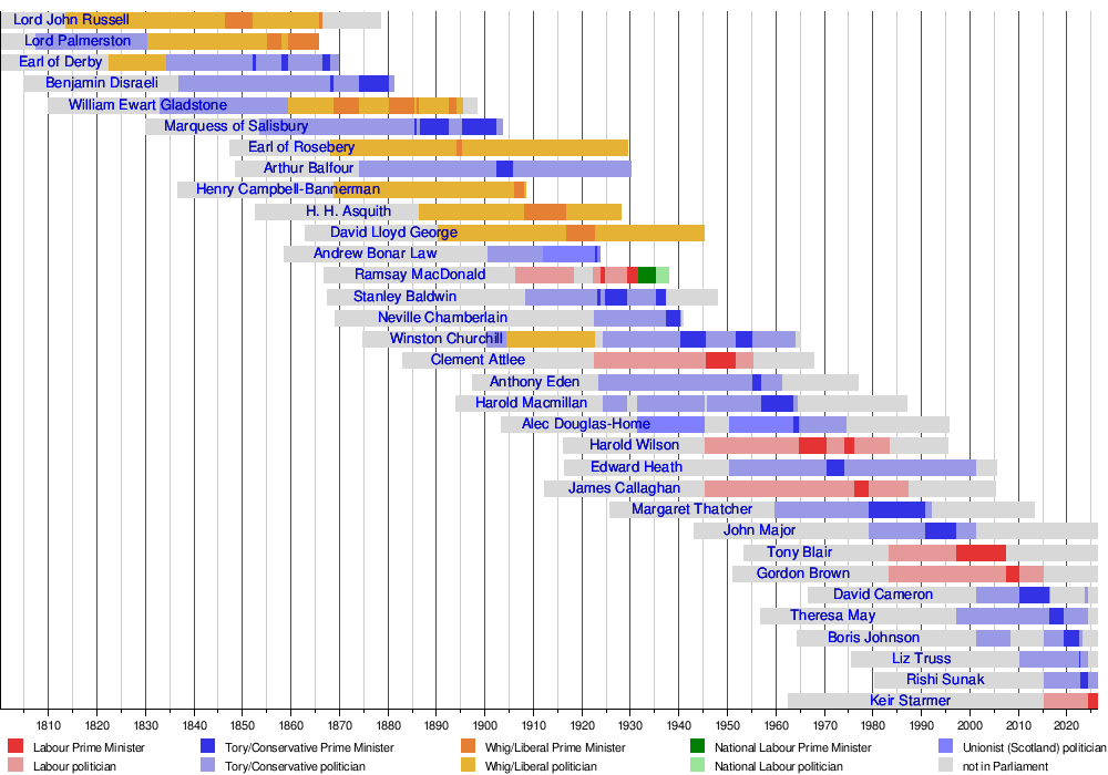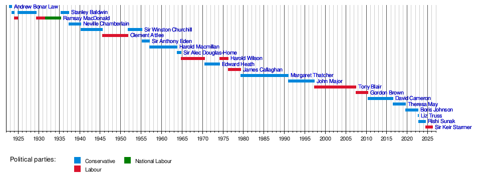 - Less than 20 years in Parliament before becoming prime minister: Baldwin, Chamberlain, Wilson, Major, Blair, Cameron, May, Johnson, Truss, Sunak, Starmer.
