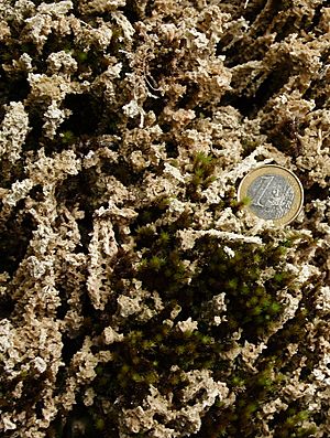 Travertine is a type of rock that forms on land. It's a sedimentary rock, which means it's made from bits of material that settle and harden over time. Travertine forms when minerals like calcium carbonate come out of water. This often happens in hot springs or other places where water flows through the ground.