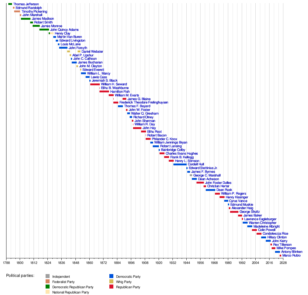 This timeline shows the people who have been secretaries of state. It also shows their political party when they started the job.