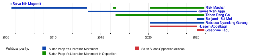 | First | Riek Machar | 21 February 2020 | Incumbent | 5 years, 267 days | SPLM-IO | Salva Kiir Mayardit | |||