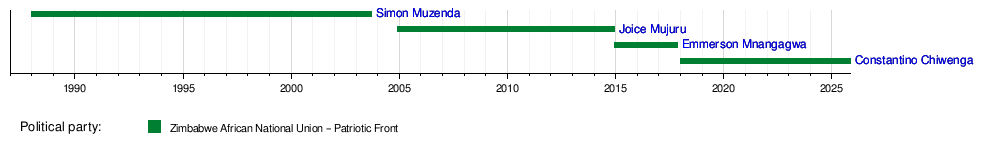 6 August 1990 | 1 July 1999 | 8 years, 329 days | ZANU–PF | Robert Mugabe (1987–2017) |