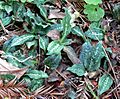 The western rattlesnake plantain has broad leaves that are shaped like a spear or an oval. Each leaf is about 4 to 9 centimeters long. They are a dark green color. A cool thing about these leaves is that the main vein in the middle has a white stripe. The other veins on the leaf also form a white net-like pattern, but these lines are not as thick as the main stripe.