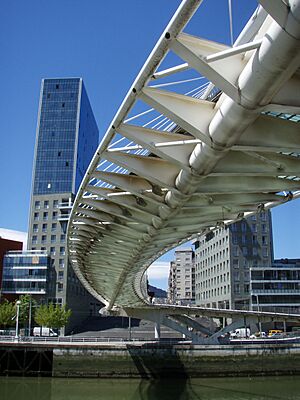The Zubizuri bridge is a special footbridge in Bilbao, Spain. Its name means "white bridge" in the Basque language. People also call it the Campo Volantin Bridge or Puente del Campo Volantin. It crosses the Nervion River and connects two parts of the city: the Campo Volantin area and the Uribitarte area. A famous architect named Santiago Calatrava designed this unique bridge.